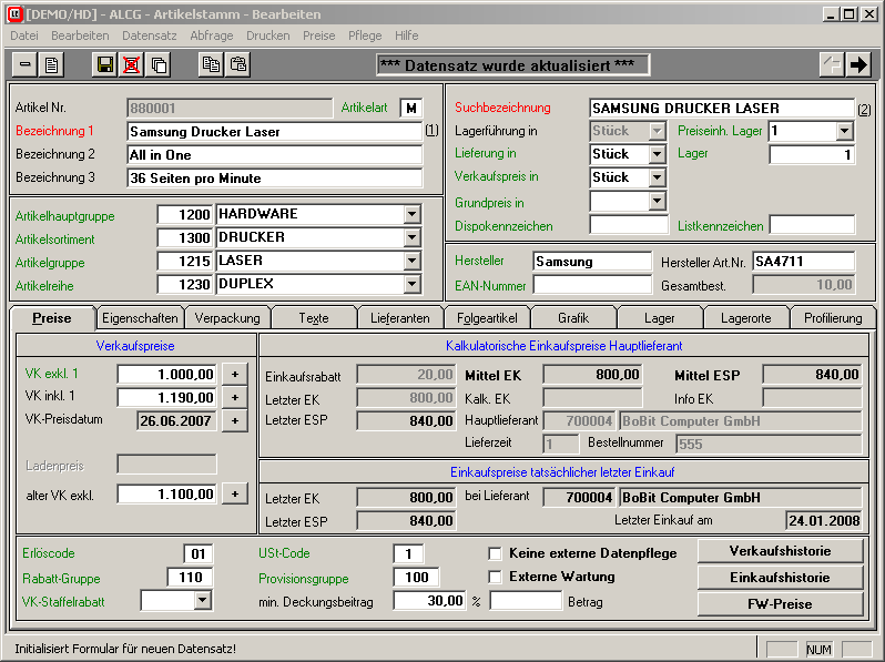 und Möglichkeit den ermittelten Wert in den Kundenauftrag und im Artikelstamm zu aktualisieren.