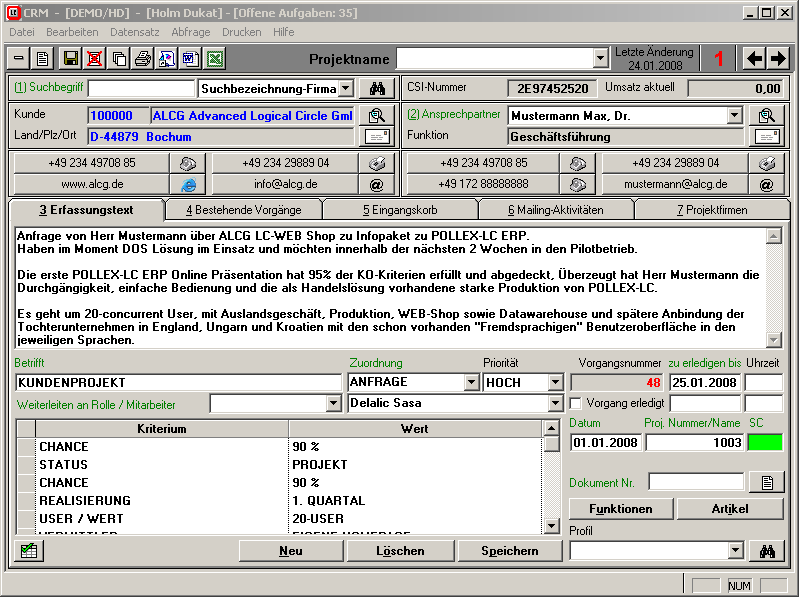 Diese dient der raschen und einfachen Erfassung aller Kontakte mit Kunden und Lieferanten mit Kunden-/Lieferantenname, Ansprechpartner, eigener Sachbearbeiter, Erfassungsdatum, Wiedervorlagedatum, Status offen/erledigt und einer automatischen Ermittlung der Kontaktdauer in Minuten (manuell übersteuerbar). Prozesssteuerung, CTI, Mail, Fax, Eskalation, Aufgabensteuerung zu jedem Vorgang, Mail-Call-Mail Funktion für Nachfassaktionen zu Mailings die aus POLLEX-LC ERP erstellt wurden.. Mit Hotlinefunktion, Hotline-Abrechnungsblatt und statistischen Schnellauskünften. Die Kunden- und Lieferantenbetreuung entspricht den Anforderungen der ISO 9000 im Hinblick auf Nachvollziehbarkeit und Dokumentationspflicht. Die Lieferantenbewertung nach ISO9000 für allgemeine Kriterien ist ebenfalls hier integriert.