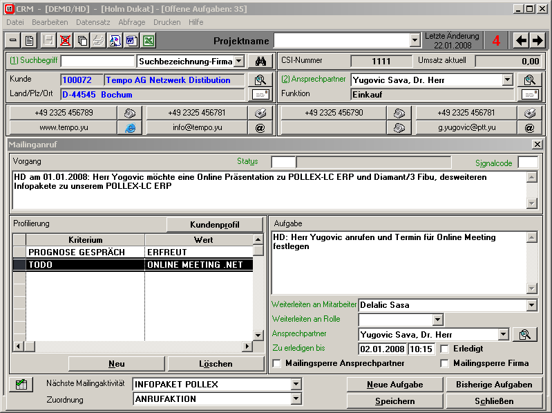CRM – „MAIL-Call-Mail“ Funktion, Nachfassen zu POLLEX-LC ERP Mailings mit Klassifizierung und Anlage weitere Schritte