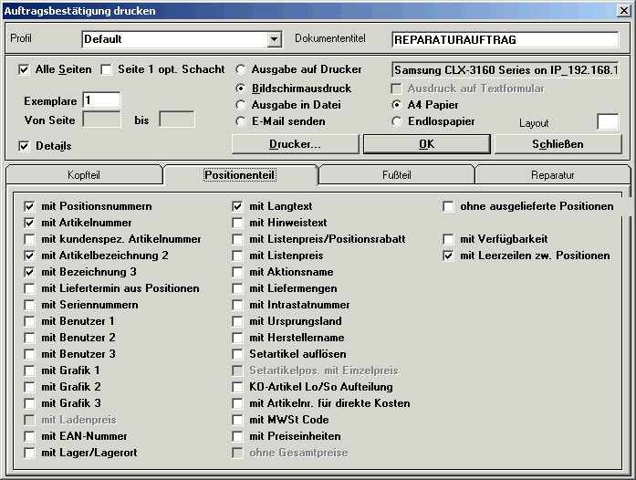 Die Vielzahl der bereits im Standard von POLLEX-LC ERP vorgefertigten Reports (z.B. für Angebote, Auftragsbestätigungen, Lieferscheine, Rechnungen, Bestellungen, Wareneingänge, Eingangsrechnungen, etc.), können mit dem ADHOC Druck-Reporter beim jeweiligen Ausdruck auf den Bildschirm-, Drucker-, in Datei- oder als Email Anhang, mittels „Aktivieren“ oder „Deaktivieren“ von Flaggs, Inhalte und Design auf den Dokumenten verändert und gesteuert werden. Selbstverständlich werden die beim Druck des Dokumentes gesetzten Flaggs zum Dokument gespeichert. Somit kann zu jedem Zeitpunkt das Dokument in seiner damaligen „Originalform“ erneut gedruckt werden. Mit dieser Funktionalität können zu unterschiedlichsten, z.B. Angebotsvarianten (mit oder ohne Rabatt, Langetext ja/Nein, Einzelpreise ja/nein um nur einige Beispiel zu nennen) neu zu erstellende „Druckprofile“ erzeugt werden, diese „Druckprofile“ können aus der Kombobox beim Druck selektiert werden, oder auch ganz speziell Kunden zugeordnet werden, sodass automatisch von POLLEX-LC ERP das beim Kunden hinterlegte Druckprofil selektiert wird.