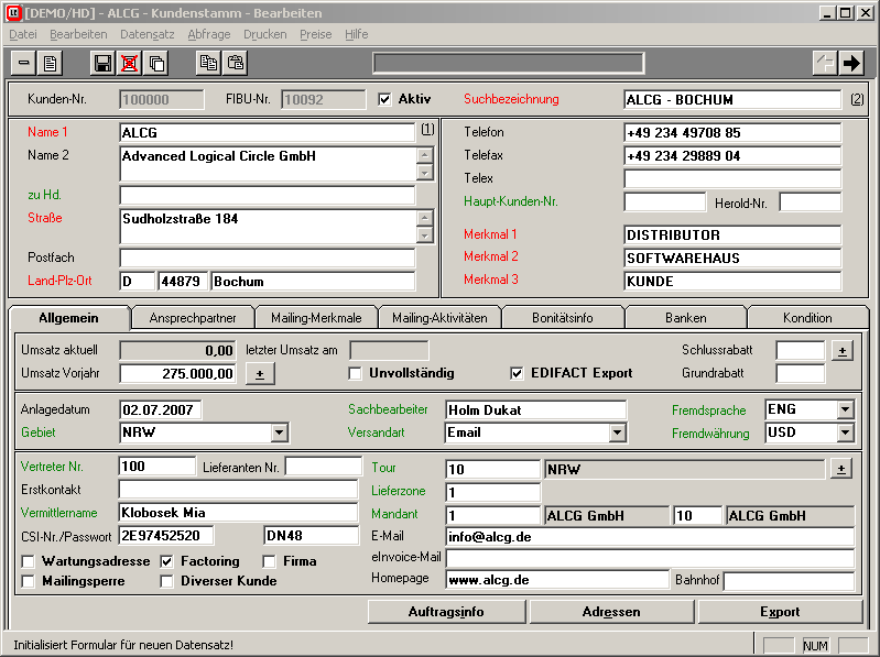 Kunden, Lieferanten, Vermittler, Banken, Artikel, Stücklisten, Personal, Textbausteine, Grundlagen. Mit Ansprechpartnerverwaltung.