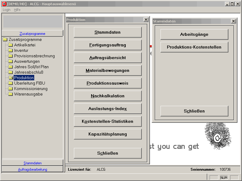 Ermöglicht die Erstellung von n-stufigen Baugruppen im Artikelstamm. Aus den Baugruppen können Fertigungsaufträge erstellt werden, die mit Materialentnahmen und Fertigproduktzubuchungen bebucht werden. Über Zuordnung von Maschinen- und Arbeitsstunden (mit Kostenstellen) sowie Restmaterial-Zuordnung kann ein Fertigungsauftrag abgeschlossen werden. Eine Nachkalkulation mit Auswertung von Maschinendaten und Fertigungszeiten ist ebenso inkludiert wie die Erstellung von Materialscheinen, Dispositionslisten und Produktionsausweisen, Materialübersicht, Arbeitsgänge, Mindestbestandsverwaltung und Fremdfertigungsaufträgen