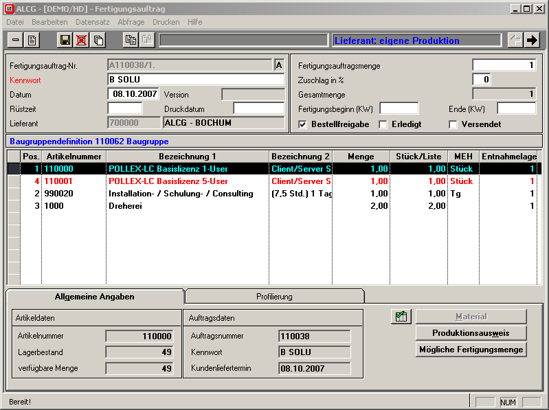 für Kundenauftrag-, Lagerauftrag und auch als Fremdfertigungsauftrag möglich, autom. Reservierung der Einzelkomponeten und Disposition