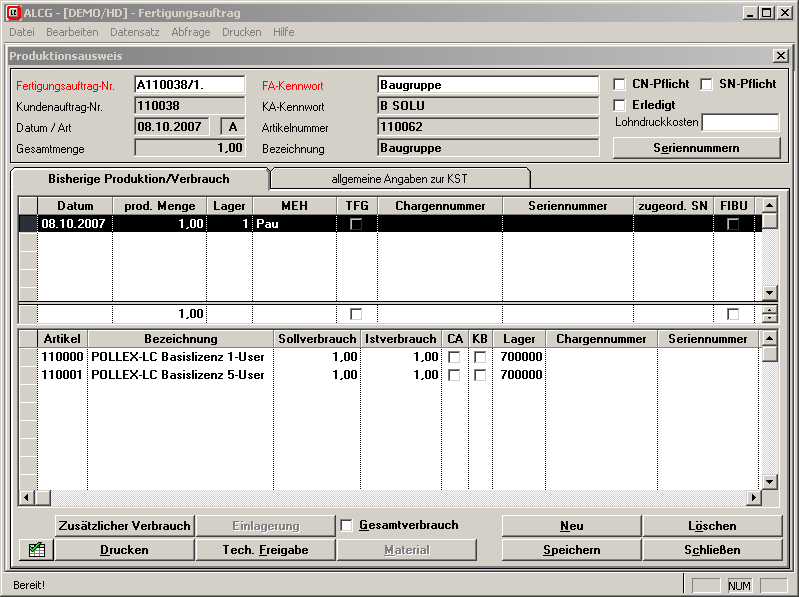 Produktionsfertigmeldung in POLLEX-LC ERP