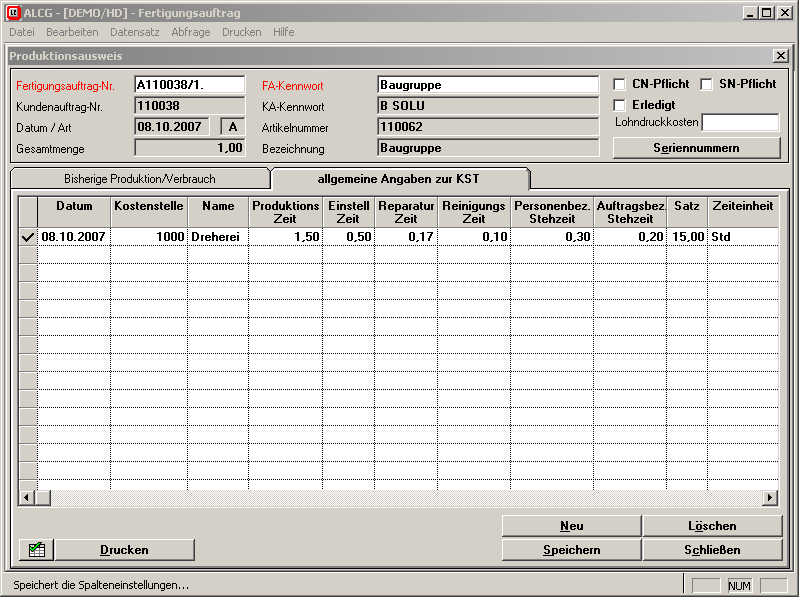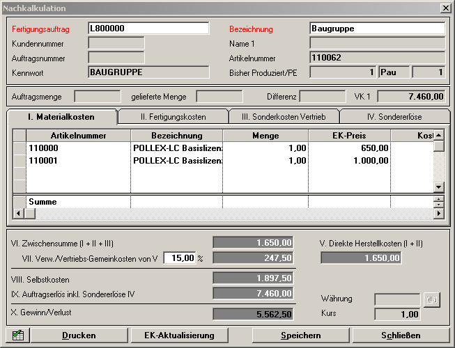 Nachkalkulation des Fertigungsauftrag in POLLEX-LC ERP